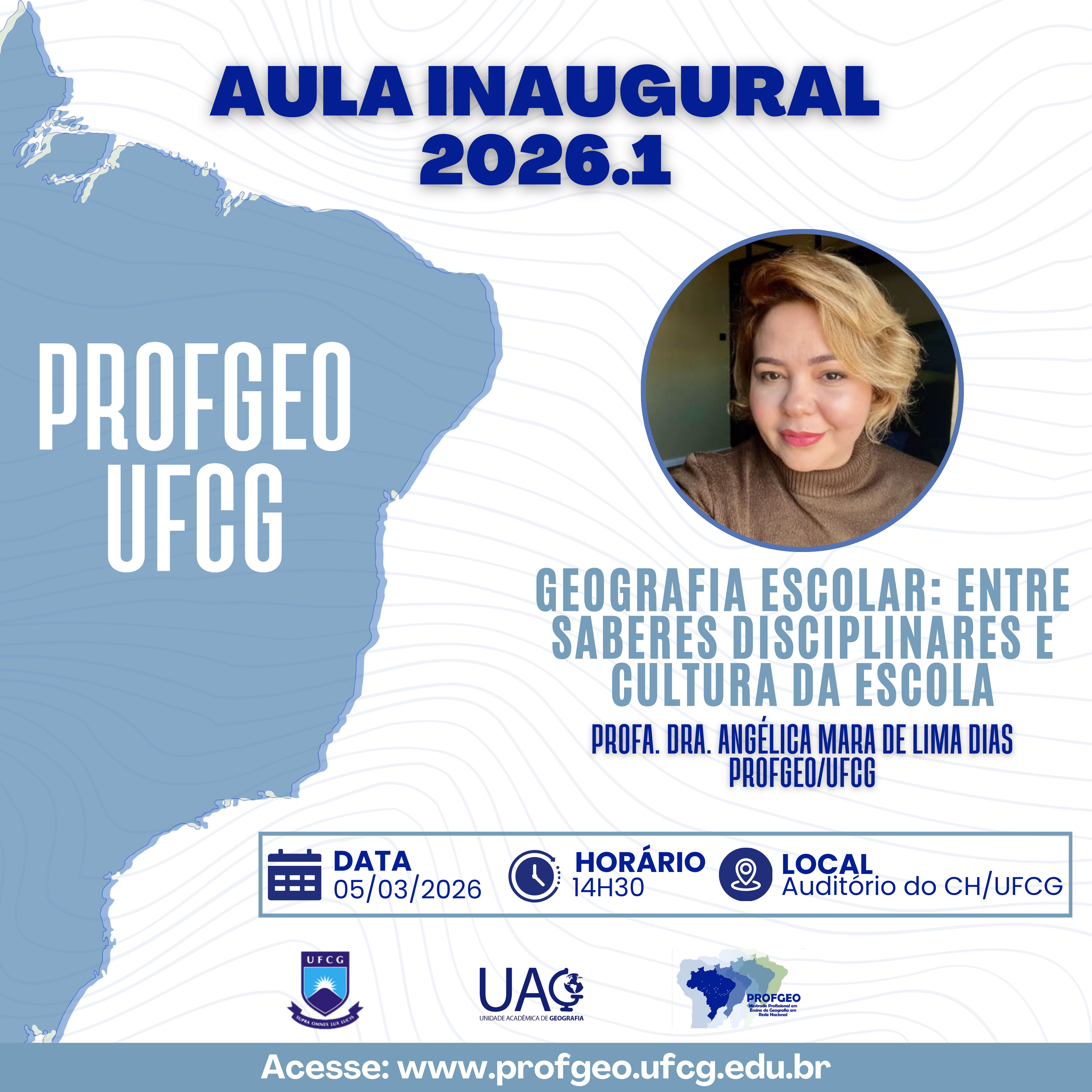 A Aula Inaugural 2026.1 do PROFGEO/UFCG marca o início de mais um ciclo formativo universitário à qualificação de professores de Geografia e ao fortalecimento do ensino na Educação Básica. O encontro tem como objetivo promover a integração entre discentes e docentes, além de estimular reflexões sobre a prática pedagógica e os desafios contemporâneos da Geografia Escolar. Trata-se de um momento de acolhimento da nova turma e de reafirmação do compromisso com uma formação contextualizada e socialmente relevante. Nesta edição, será realizada a aula inaugural intitulada “Geografia Escolar: entre saberes disciplinares e cultura da escola” , ministrada pela Profa. Dra. Angélica Mara de Lima Dias, que abordará as relações entre os conhecimentos geográficos, a cultura escolar e as práticas docentes no contexto educacional atual. 📅 Data: 05 de março de 2026 |