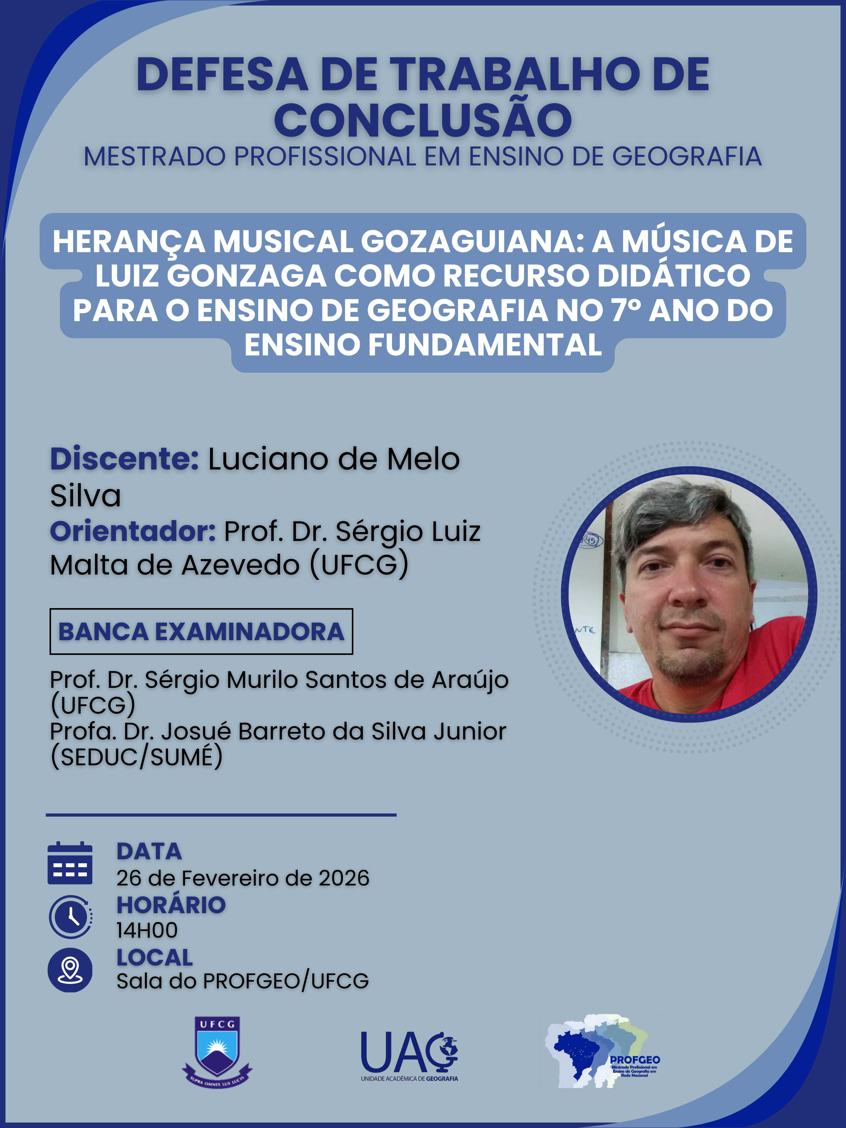 Defesa de Trabalho de Conclusão de Curso – Mestrado em Ensino de Geografia O PROFGEO/ Universidade Federal de Campina Grande informa a realização da defesa do Trabalho de Conclusão de Mestrado do discente Luciano de Melo Silva , intitulado “Herança musical gozaguiana: a música de Luiz Gonzaga como recurso didático para o ensino de Geografia no 7º ano do ensino fundamental” . A pesquisa explora a música como recurso pedagógico, destacando a obra de Luiz Gonzaga como elemento de mediação no ensino de Geografia e valorização da cultura regional. 📅 Data: 26 de fevereiro de 2026 |