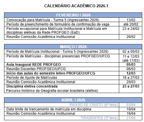Calendário Acadêmico 2026.1