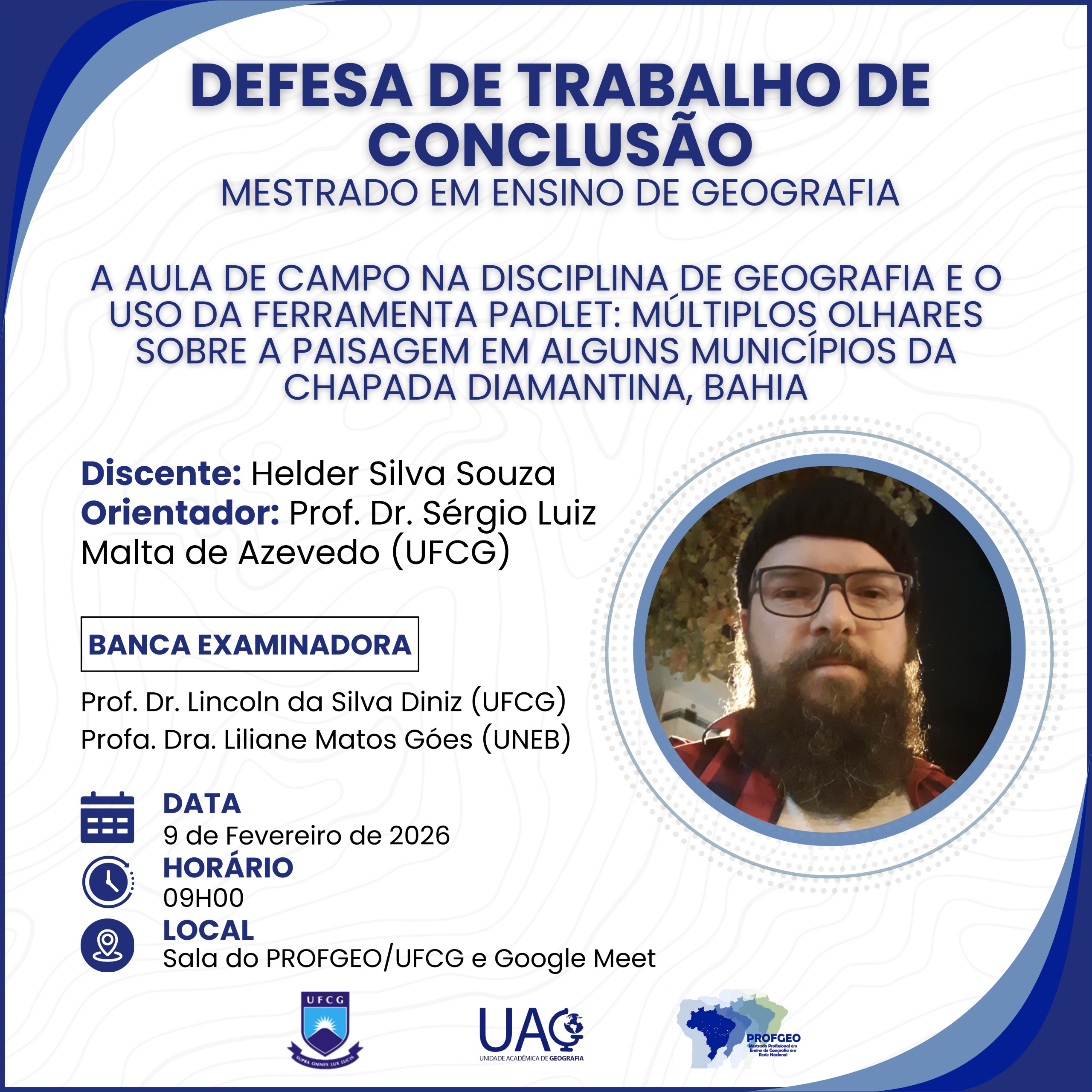 O PROFGEO/UFCG informa a realização da defesa do Trabalho de Conclusão de Mestrado do discente Helder Silva Souza, intitulado “A aula de campo na disciplina de Geografia e o uso da ferramenta Padlet: múltiplos olhares sobre a paisagem em alguns municípios da Chapada Diamantina, Bahia”.