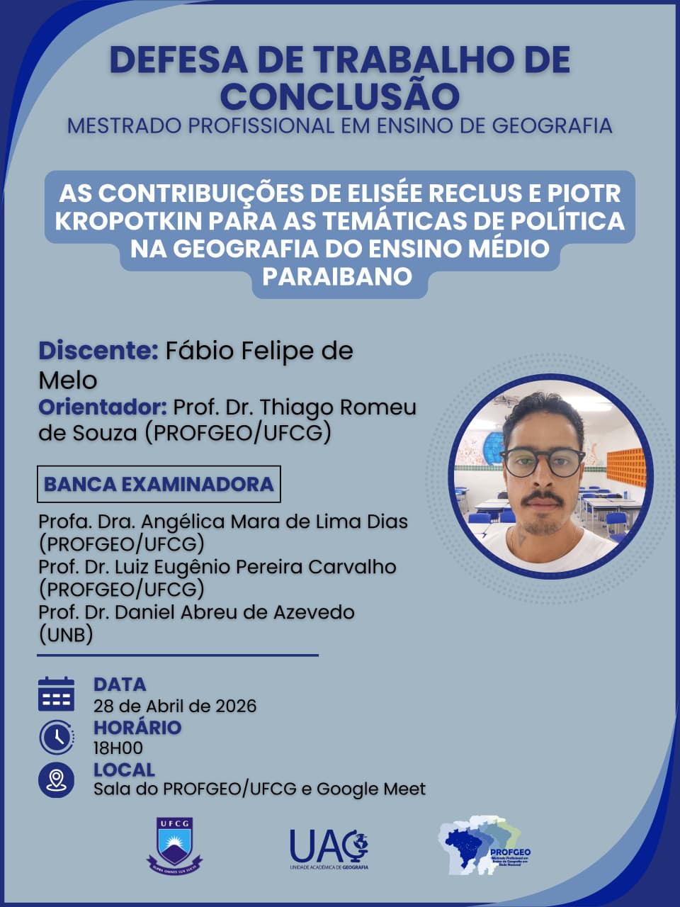 O PROFGEO/UFCG informa a realização da defesa do Trabalho de Conclusão de Mestrado do discente Fábio Felipe de Melo , intitulado “As contribuições de Elisée Reclus e Piotr Kropotkin para as temáticas de política na Geografia do Ensino Médio Paraibano” , trabalho que foi desenvolvido sob orientação do Prof.